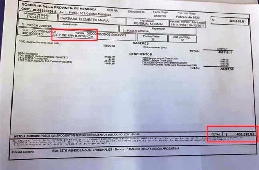 La comparación de los bonos de sueldos a la que accedió MDZ es reflejo de la situación. Carbajal percibió en febrero de este año algo más de $406.000 y así lo demuestra este recibo que se difundió en su momento.