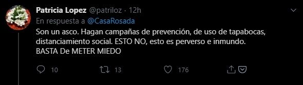 "No testearon, HAGANSE CARGO!", respondió otro, en uno de los mensajes que más "me gusta" recibió. "Son un asco. Hagan campañas de prevención, de uso de tapabocas, distanciamiento social. ESTO NO, esto es perverso e inmundo. BASTA De METER MIEDO", se indignó una usuaria.