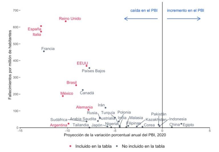 Como es posible observar en la tabla presentada a continuación, la selección realizada no incluye a países en los cuales tanto la caída del PBI como la cantidad de fallecidos son menores que en la Argentina, o casos donde la cantidad de muertes es similar, pero la caída del PBI es menor. Se pueden destacar Egipto (con 23,1 muertes por millón de habitantes) y China, donde incluso se proyecta un incremento del PBI y se registran menos fallecidos por millón de habitantes que en nuestro país. Otro ejemplo podría ser Tailandia, donde se proyecta una caída del PBI similar a la Argentina, pero se registran muchos menos fallecidos.