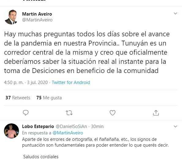 La iniciativa pareció coordinada y los dirigentes salieron con fuerza. En su entusiasmo comunicacional por la red social el intendente de Tunuyán Martín Aveiro tuvo un problema: escribió “desición”, con el error de ortografía expuesto al público. La misma decisión que tuvo para reclamar, le faltó para corregir el mensaje antes de ponerle "enviar" en la red del pajarito. Quizá estaba emulando a algunas maestras que dan clases públicas por el canal oficial nacional donde escribieron "sepillo".