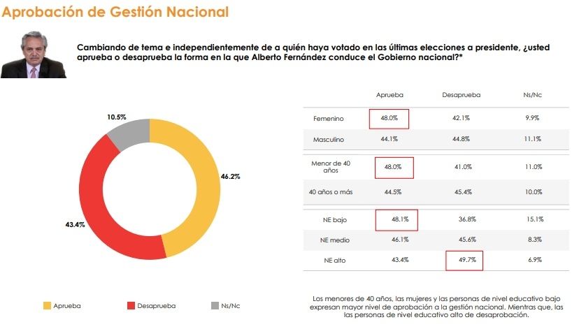 Un relevo de Management & Fit a 2.200 personas demostró que la conducción del Gobierno nacional en medio de la pandemia está en su peor momento de popularidad. En el último mes la aceptación cayó más de dos puntos al 46,2%, mientras que el rechazo subió de 35,2% a 43,4%. El pico de imagen positiva había sido en abril, cuando alcanzó el 57%.
