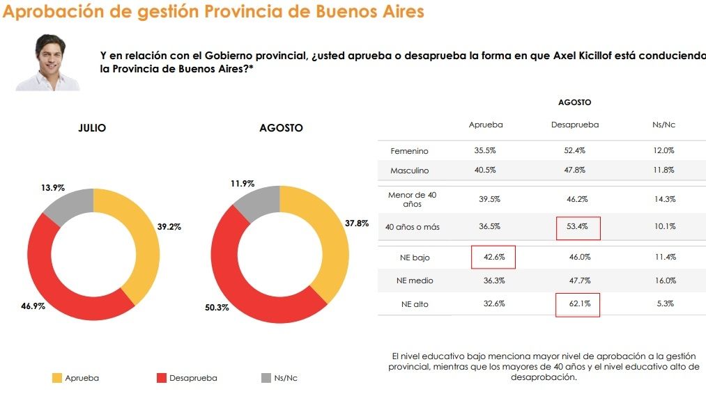 Otro que la está pasando mal durante los últimos meses, por lo menos en lo relativo a imagen pública, es el gobernador de Buenos Aires, Áxel Kicillof. El rechazo a su conducción del gobierno subió de 46,9% a 50,3%. En cambio, su aprobación bajó de 39,2% a 37,8%. Entre quienes rechazan su gestión se registró un 16,7% que sí aprueba el gobierno de Alberto Fernández.