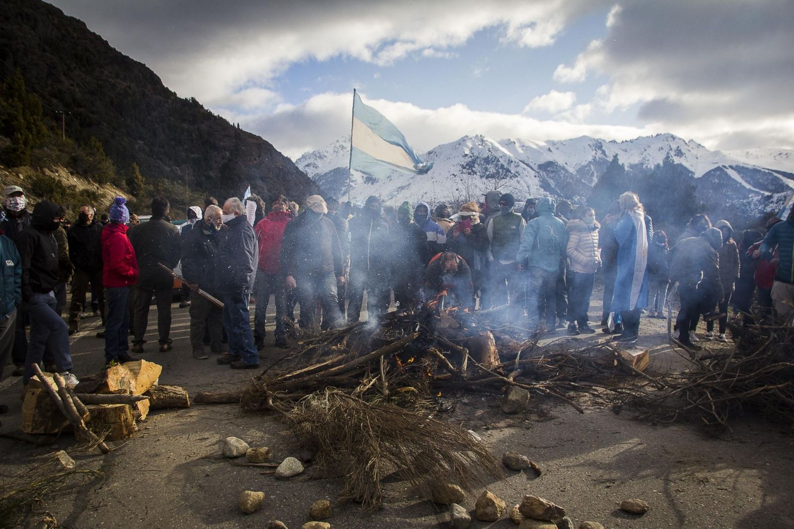 Ayer, a la altura del Lago Gutiérrez, unos 200 vecinos de Villa Mascardi cortaron la ruta nacional 40. Llevaban banderas y carteles contra la ocupación que desde 2017 mantienen miembros del Lof Lafken Winkul Mapu. Durante varios momentos se vivió una gran tensión porque la policía no permitía el paso de autos mientras que, al mismo tiempo, unos 20 encapuchados se mantenían expectantes con palos y gomeras.