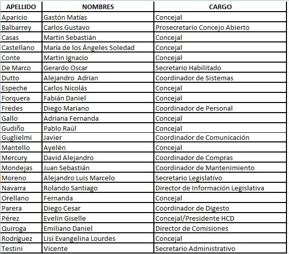 En la respuesta formal que el Concejo Deliberante le dio al segundo pedido de acceso a la información pública sólo aparecían los nombres de algunos funcionarios y los 12 concejales. En total, 24 nombres fueron facilitados. "El detalle de la nómina es una información que no estamos en condiciones de dar a publicidad, por no contar con ese consentimiento de acuerdo a los alcances de las garantías constitucionales, la Ley Nacional N° 25326 de protección de datos personales, y las excepciones previstas en la Ley Provincial N° 9070 de Acceso a la Información Pública", esgrimieron para evitar dar más información.