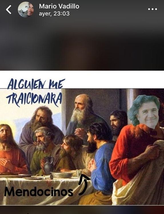 La pelea en Protectora parece haber tomado ribetes místicos, ya que Mario Vadillo sumó un meme religioso al enfrentamiento con José Ramón. Fue un ataque público pero no tan público: el abogado publicó en su cuenta de WhatsApp un meme con la imagen de la última cena del pintor danés Carl Bloch. "Alguien me traicionará", dice el meme. Jesús es, según se remarca, el pueblo mendocino. Judas es Ramón. Sutileza 0.