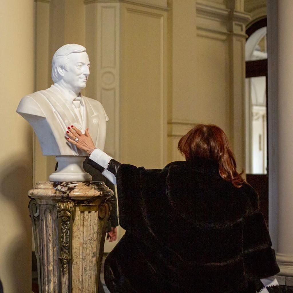 Pero hubo un gesto que no se vio en su ingreso y que sí fue difundido luego. Cuando ingresó, Cristina se acercó a la zona donde están los bustos de los ex presidentes. Particularmente al de su esposo, Néstor Kirchner (que fue presidente entre 2003 y 2007). Con una especie de ritual, lo tocó y siguió camino.