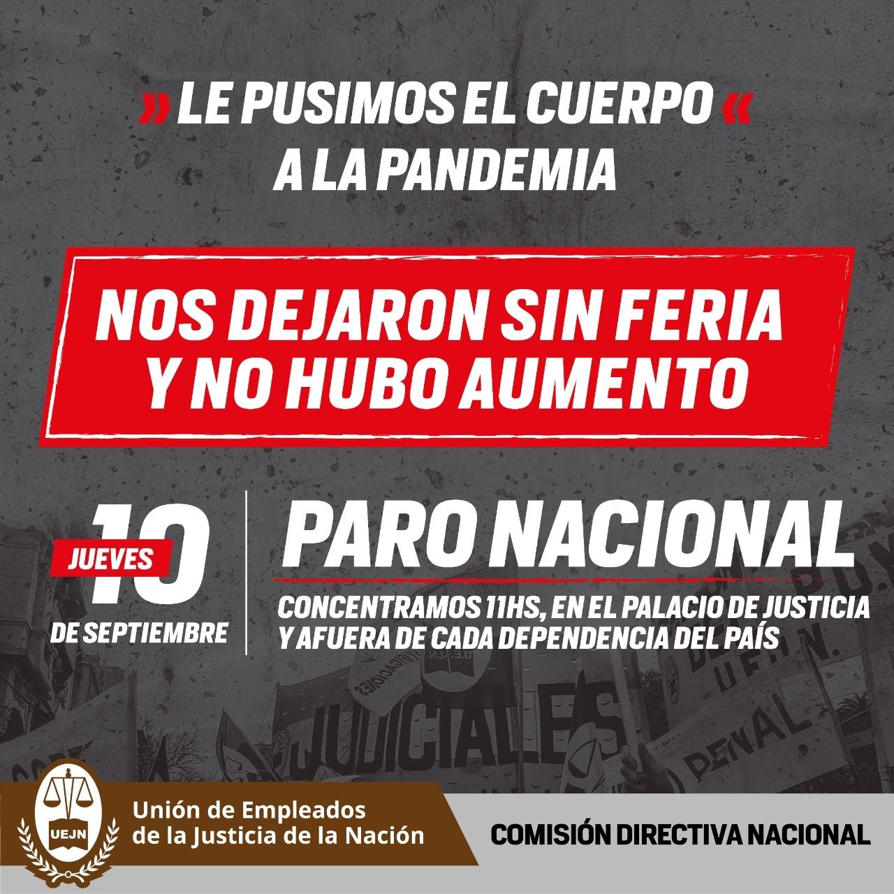 "Los judiciales de Cuyo nos manifestamos con responsabilidad, con distanciamiento y con barbijos pero sobre todo con dignidad, en la puerta de cada uno de los edificios. En Mendoza nos juntamos a las 10 en la puerta del edificio de España y Pedro Molina", expresaron desde la Unión de Empleados de Justicia de la Nación.