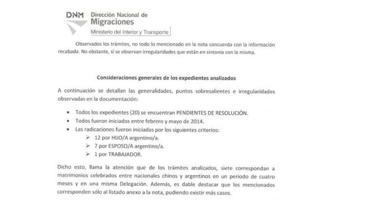 Se investigaron unos 20 expedientes y se encontró la existencia de irregularidades como, por ejemplo, que siete de los pedidos eran por matrimonios producidos poco tiempo antes o, como en cinco de los casos, donde el extranjero no tenía un ingreso legal al país. Además, en todos los casos habían arribado del Paraguay.
