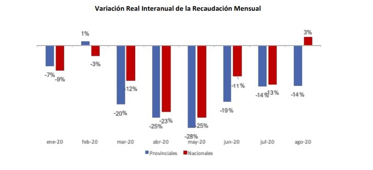Según informan desde el Ministerio de Hacienda, la caída de la recaudación en el mes de agosto fue del 16% interanual en los recursos tributarios provinciales y del 12% en los recursos nacionales. Los datos estadísticos muestran el impacto que la caída en el nivel de actividad ha tenido sobre los recursos obtenidos a partir de marzo 2020 luego de la declaración de cuarentena debido a la pandemia por COVID-19.