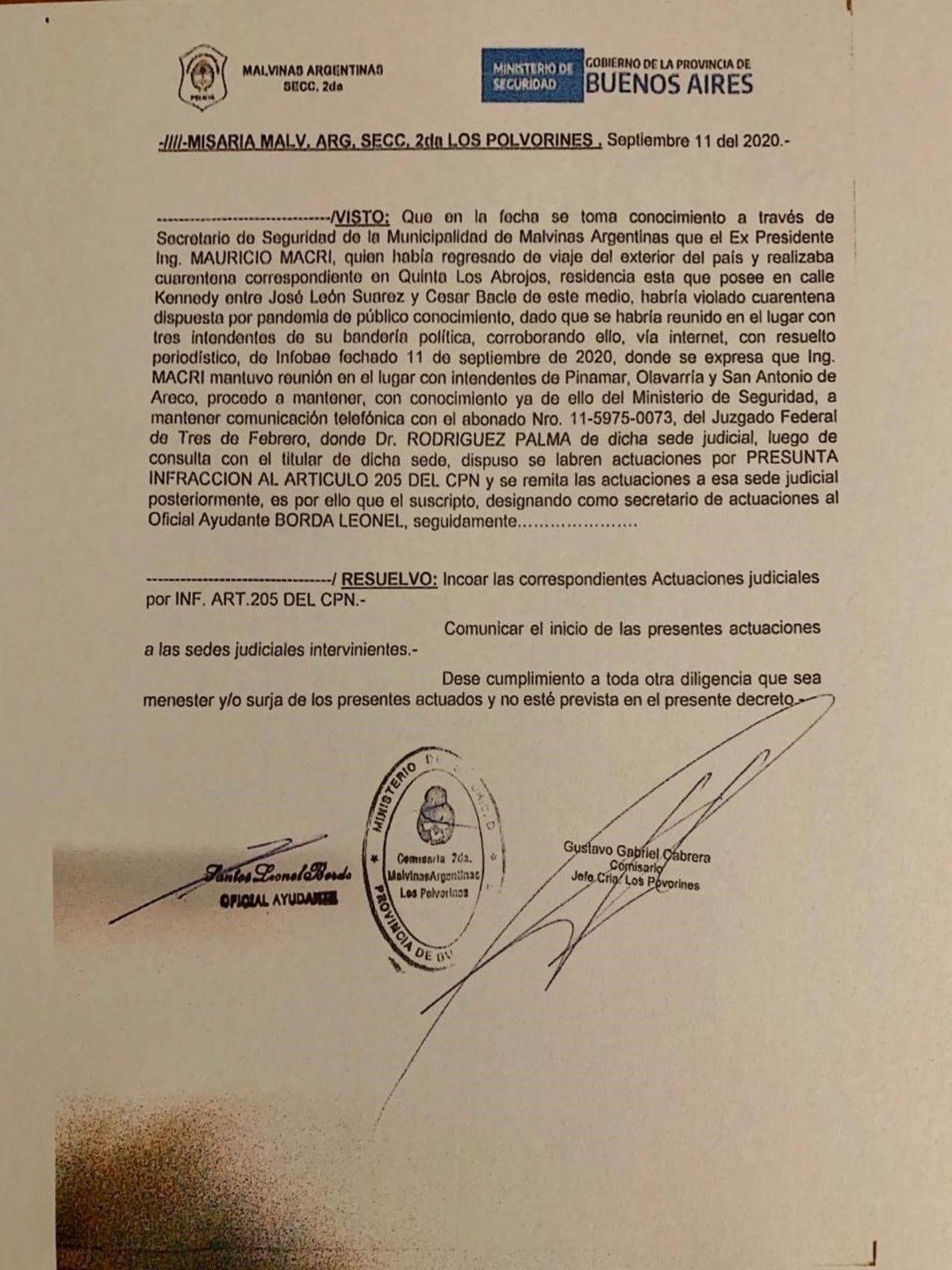 Según el entorno del líder del PRO, Cancio se comunicó con el jefe de policía de la comisaría de Los Polvorines, Gustavo Gabriel Cabrera, cuando se enteró que el intendente de Pinamar, Martín Yeza, había publicado un mensaje en Twitter que reconocía haberse reunido con Macri en Los Abrojos, lo que a ojos del funcionario municipal implicaba una violación de la cuarentena. Por ende, Cabrera se puso en contacto con el Juzgado Federal de Tres de Febrero para que intervenga contra el expresidente.