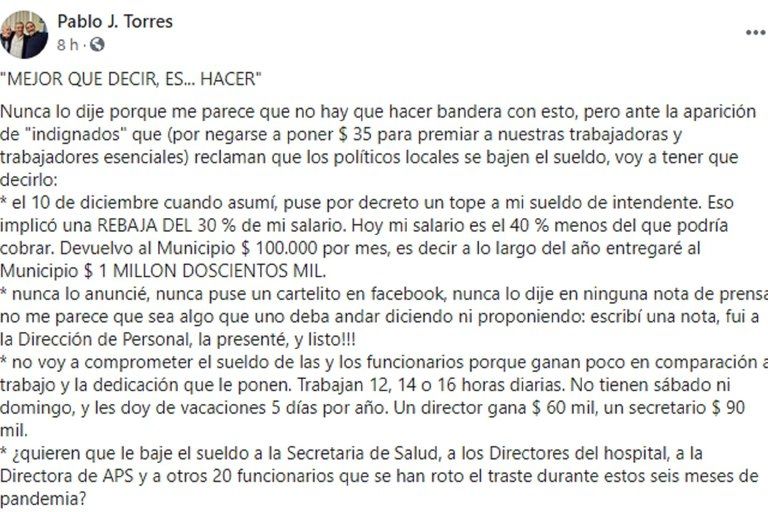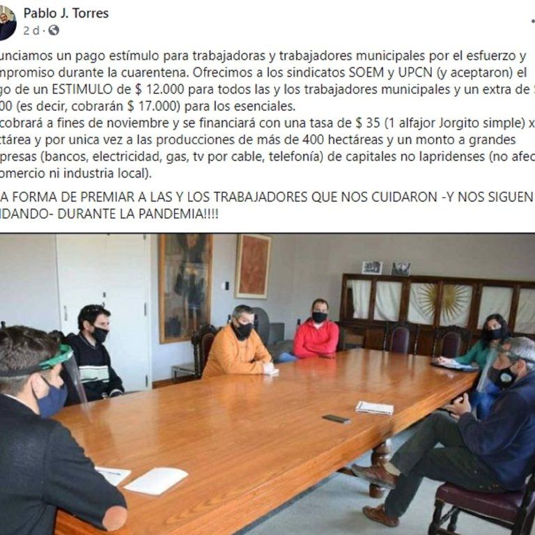 Pablo Torres, intendente de Laprida, publicó en su cuenta de Facebook que pagará un bono estímulo a los trabajadores municipales y al personal de la salud. Ese dinero saldrá de un curioso y polémico impuesto, que será equivalente a un “alfajor Jorgito simple”.