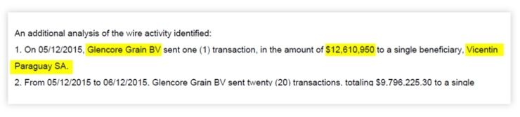Según informa el diario La Nación, un reporte bancario mostró que Glencore, la empresa suiza investigada en varios casos de corrupción, envió giros a la filial paraguaya de Vicentin por más de US$ 12 millones. Actualmente, esa misma filial está en la mira de la AFIP, la Unidad de Información Financiera (UIF) y el Banco Nación, que ya radicaron denuncias judiciales contra la empresa por presunto lavado, evasión y fraude.