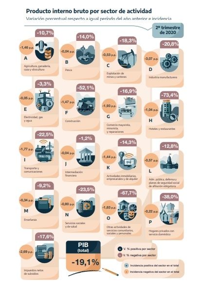 En datos duros, el Producto Interno Bruto (PIB) "se contrajo 16,2% en términos desestacionalizados respecto del primer trimestre del año, y 19,1% en la comparación interanual frente a igual período de 2019". Es difícil de mensurar, pero es un recorte brutal a la generación de riqueza de todo el país. Y la caída fue genera. "Los 16 sectores de actividad disminuyeron su producción en el segundo trimestre respecto del mismo período del año pasado", explica el informe del Indec. Las estadísticas tienen cambios metodológicos para adecuarse al contexto de pandemia y el propio INDEC lo aclara.