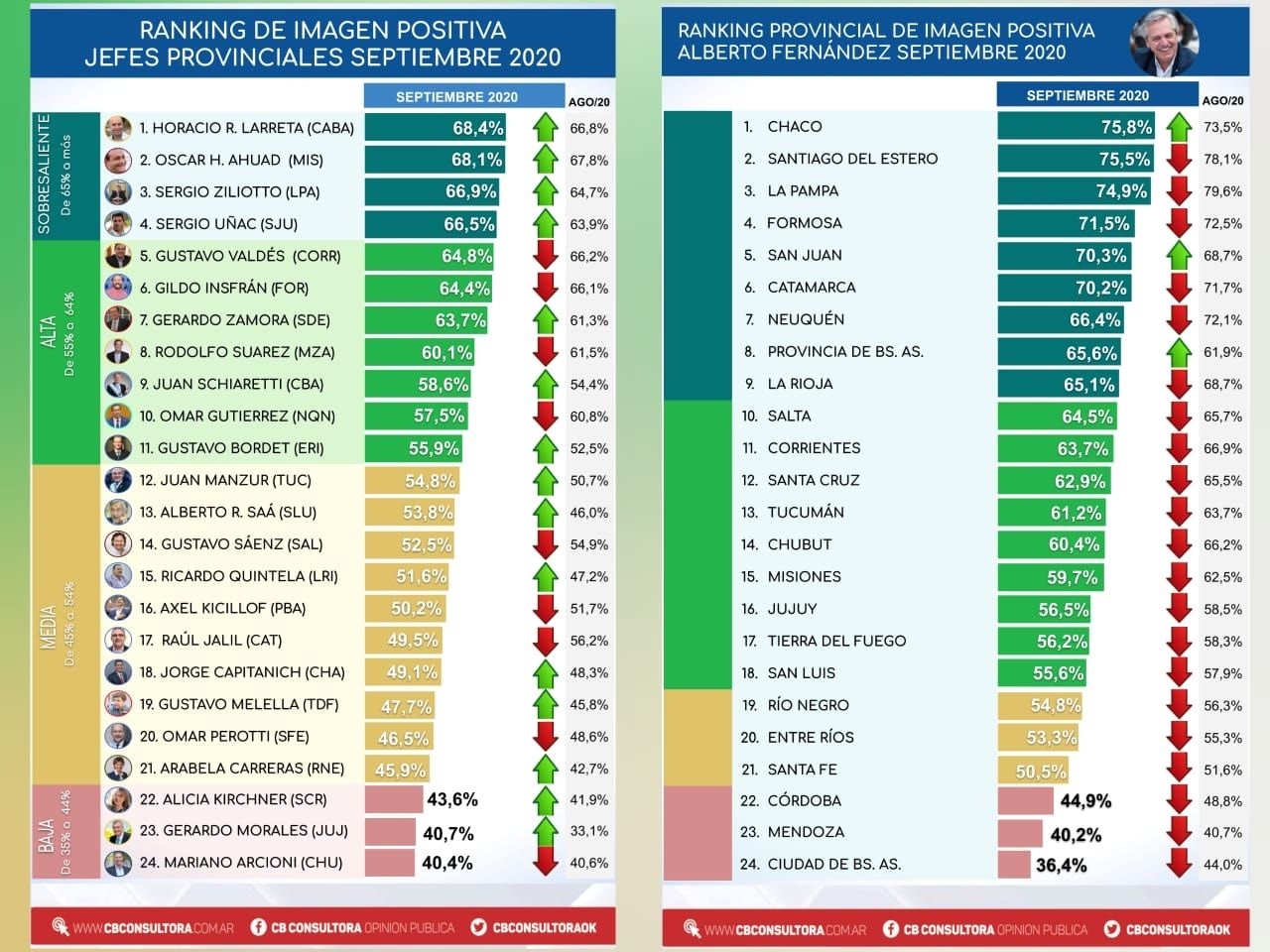 La tabla la elabora CB Consultora Opinión Pública, una firma con origen en Córdoba con mediciones en todo el país. El orden de los 24 mandatarios se hace según la imagen positiva que tienen en su distrito. En cada provincia, se relevaron entre 500 y 1.300 casos. Los resultados se presentaron con un margen de error de +/- 3,6%.