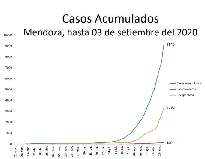 Hay tres datos que marcan que Mendoza está en la fase más compleja de la pandemia. La curva de contagios es casi vertical y explosiva, por un lado. Pero además la contagiosidad (el factor R) aumentó y una persona contagia a "1,7". Lo ideal es estar abajo de 1 y Mendoza había logrado mantenerse cerca. La duplicación de casos ocurre cada 13 días, pero con un detalle preocupante: ahora la base de casos es alta y por eso la duplicación impacta fuertemente. Como ya reveló MDZ, la cantidad de casos positivos relacionados con la cantidad de testeos también es elevada y ese indicador está muy alejado del ideal.