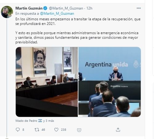 Horas antes de que termine el año, el ministro de economía, Martín Guzmán, planteó en su cuenta de Twitter que la recuperación económica de la Argentina en 2021 dependerá de la construcción de consensos políticos y que el sector público y el privado actúen como socios para potenciar las oportunidades de inversión y generación de empleo.
