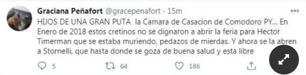 "HIJOS DE UNA GRAN PUTA la Cámara de Casación de Comodoro Py....En Enero de 2018 estos cretinos no se dignaron a abrir la feria para Hector Timerman que se estaba muriendo, pedazos de mierdas. Y ahora se la abren a Stornelli, que hasta donde se goza de buena salud y esta libre", escribió Peñafort.