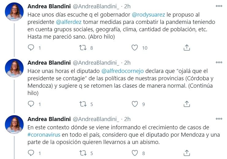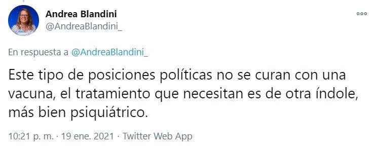 "Este tipo de posiciones políticas no se curan con una vacuna, el tratamiento que necesitan es de otra índole, más bien psiquiátrico", aseguró la legisladora en su cuenta de Twitter, dando a entender que el exgobernador mendocino debería tratarse en su salud mental.