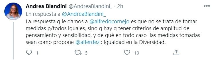 Dejando de lado las insinuaciones controvertidas, la peronista oriunda de Godoy Cruz (quien en las elecciones municipales de 2019 perdió contra el delfín cornejista, Tadeo García Zalazar) retomó la temática educativa y le aseguró a Cornejo que "no se trata de tomar medidas para todos iguales, sino que hay que tener criterios de amplitud de pensamiento y sensibilidad, y de qué en todo caso las medidas tomadas sean como propone Alberto Fernández: Igualdad en la Diversidad".