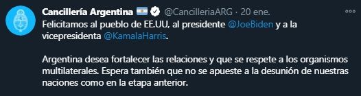 La cuenta oficial de Cancillería Argentina publicó un tuit en el que "le marcaba la cancha" a Biden pidiéndole que "respete a los organismos multilaterales" y que "no se apueste a la desunión de nuestras naciones como en la etapa anterior".
