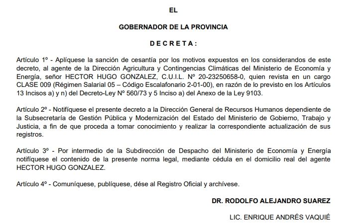 Sin embargo, se avanzó con la sanción de cesantía y se dispuso su despido en el decreto 1889 publicado en el Boletín Oficial de hoy y que lleva la firma del gobernador Rodolfo Suarez y del ministro de Economía y Energía, Enrique Vaquié.