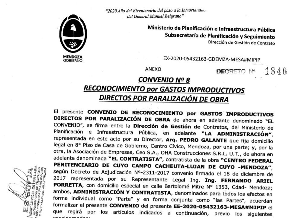 En abril del año pasado se frenaron todas las obras públicas. Eso implicó un cese de trabajos a casi cero en la mayoría de los casos. Las empresas pidieron un reconocimiento de los gastos improductivos o los gastos que debieron hacer para retomar los trabajos. El Estado analizó cada caso y lo aprobó. El enfoque que tienen los convenios es el de "compartir las pérdidas". En total hasta ahora se han reconocido 85 millones de pesos por ese ítem, pero siguen las negociaciones.