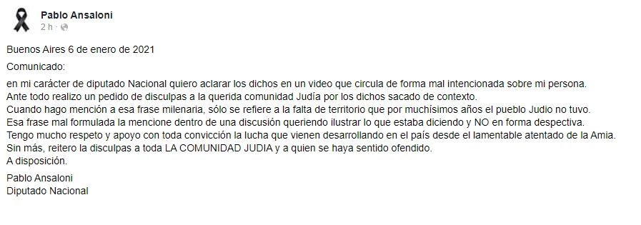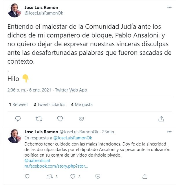 "Entiendo el malestar de la Comunidad Judía ante los dichos de mi compañero de bloque, Pablo Ansaloni, y no quiero dejar de expresar nuestras sinceras disculpas ante las desafortunadas palabras que fueron sacadas de contexto", manifestó Ramón en las redes sociales.