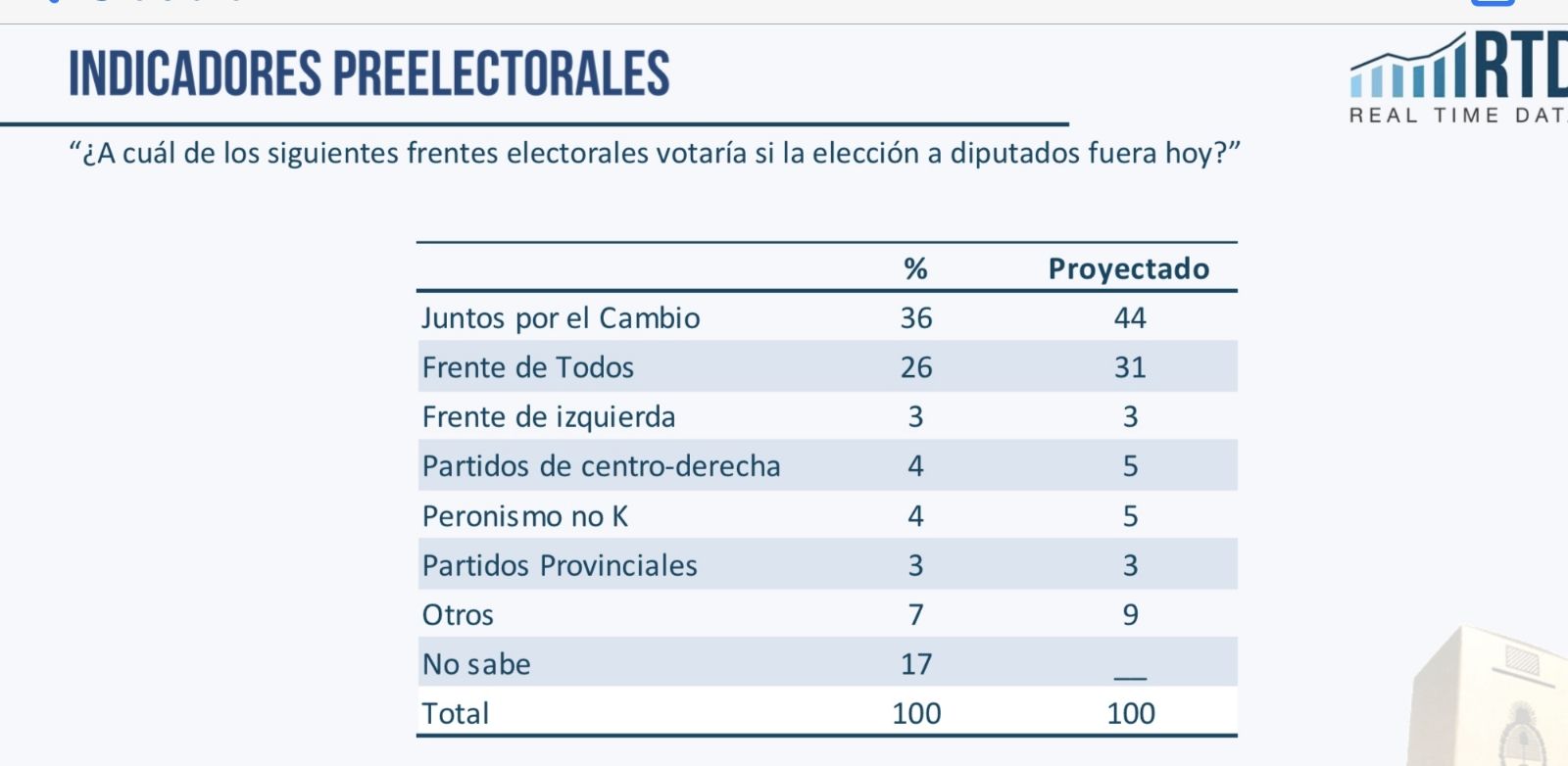 El último sondeo de la consultora Real Time Data anticipa una tendencia aún más favorable a Juntos por el Cambio a nivel nacional. La coalición opositora se impondría con el 44% contra un 31% que obtendría el oficialismo. El trabajo de opinión pública fue cerrado la semana pasada con la metodología online a 950 consultados. El resultado de las primarias y la feroz pelea interna en el seno del Frente de Todos afectaron negativamente los índices de aprobación del Gobierno de Alberto Fernández, que por primera vez cayó por debajo de los 30 puntos.