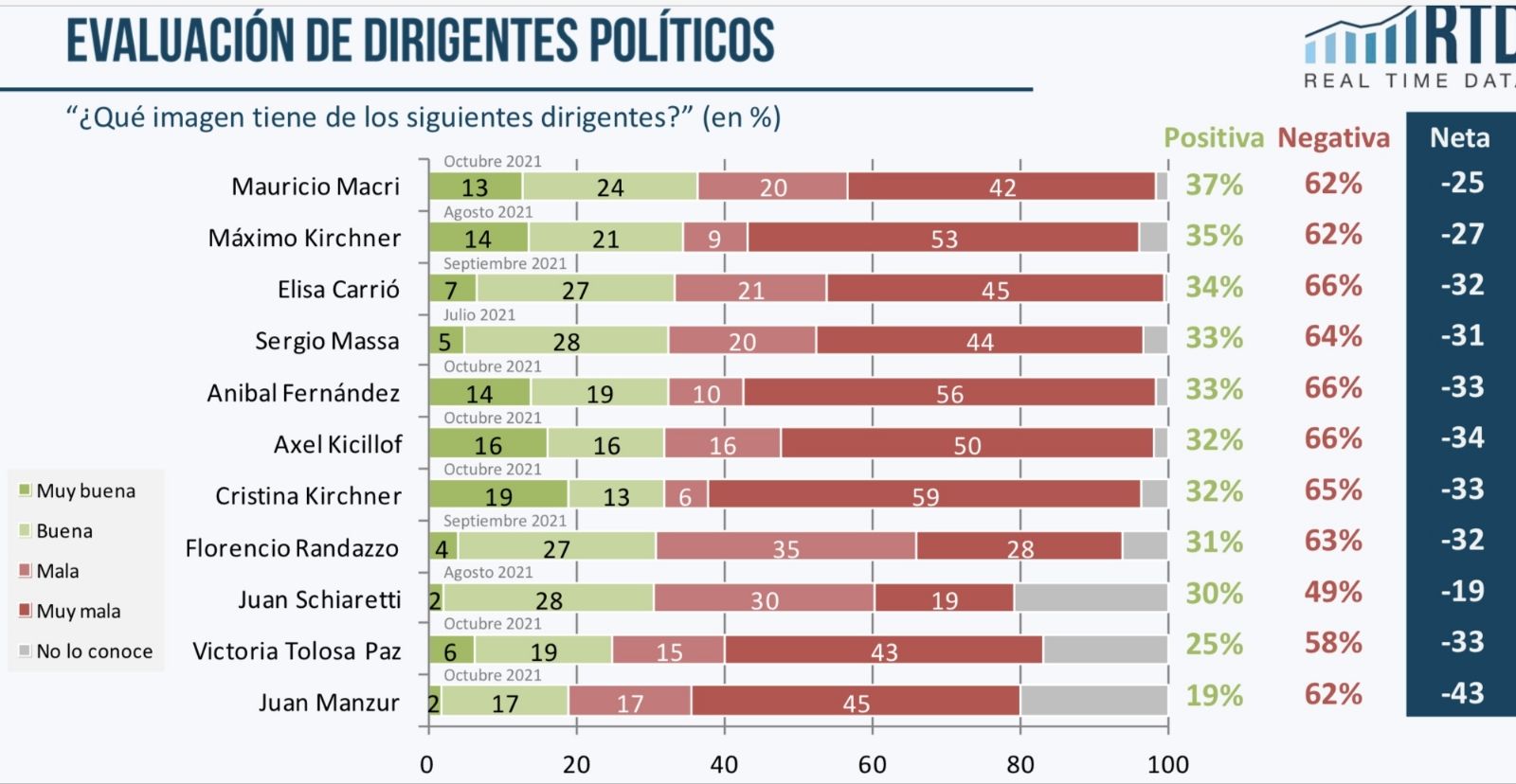 Tras las primarias, se fortalecieron las imágenes de los principales candidatos ganadores. Así, en el ranking de dirigentes mejor evaluados, subieron Manes, Santilli y Vidal, mientras que Rodríguez Larreta se mantuvo al tope del listado. Como contracara, cayeron las imágenes positivas de los referentes del Gobierno: Alberto Fernández perdió 2 puntos, Cristina cayó 9 y Kicillof resignó 7. Las nuevas incorporaciones del Gabinete, Manzur y Aníbal Fernández, registran evaluaciones deficitarias. Los dos nuevos funcionarios tienen alto rechazo en la sociedad.