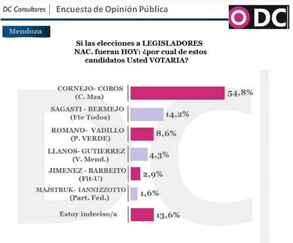 Al mismo tiempo habla de un crecimiento aún mayor en la intención de votos de Cambia Mendoza. Para DC Consultores si las elecciones fueran hoy el 54,8% votaría a la fórmula de Alfredo Cornejo y Julio Cobos. Esto representa un crecimiento casi de 13 puntos respecto a las PASO.