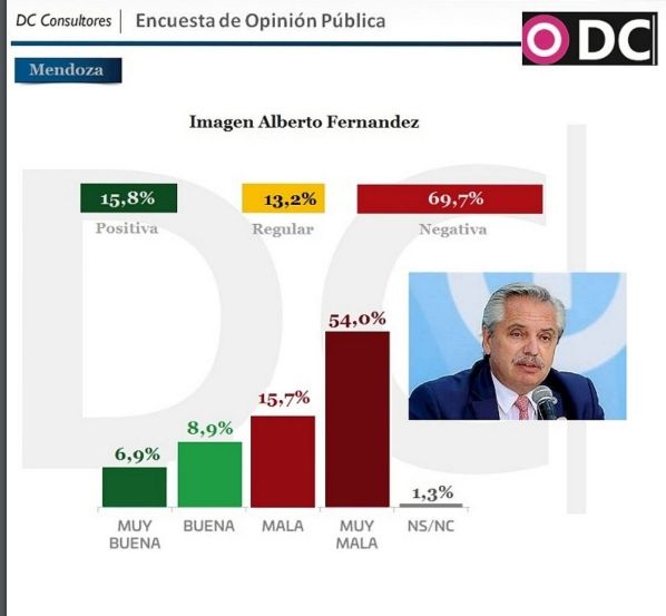 Una forma de explicar la debacle que se avizora para el peronismo en Mendoza es el derrumbe de la imagen de Alberto Fernández. En Mendoza el presidente tiene una imagen negativa del 70% y regular del 13%. Solo el 15,8% de los mendocinos tiene una imagen positiva del líder del Ejecutivo Nacional y eso estaría afectando a los candidatos del PJ.