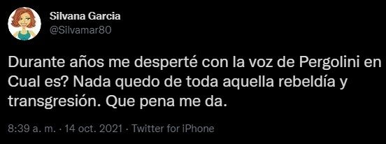 "Durante años me desperté con la voz de Pergolini en Cual es? Nada quedo de toda aquella rebeldía y transgresión. Que pena me da", expresó una fan decepcionada.