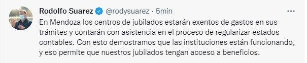 El gobernador, Rodolfo Suarez, estuvo presente en el acto de firma de convenio entre la Federación de los Jubilados Mendocinos y el Partido de los Jubilados, con el objetivo de lograr mejores condiciones a sus respectivos afiliados. En esa actividad, el mandatario destacó, que asumió el compromiso de que Juntos por el Cambio sea la voz del Partido de los Jubilados en Congreso de la Nación. Por ese motivo, pidió que apoyen la candidatura de Alfredo Cornejo como senador nacional y Julio Cobos como diputado.