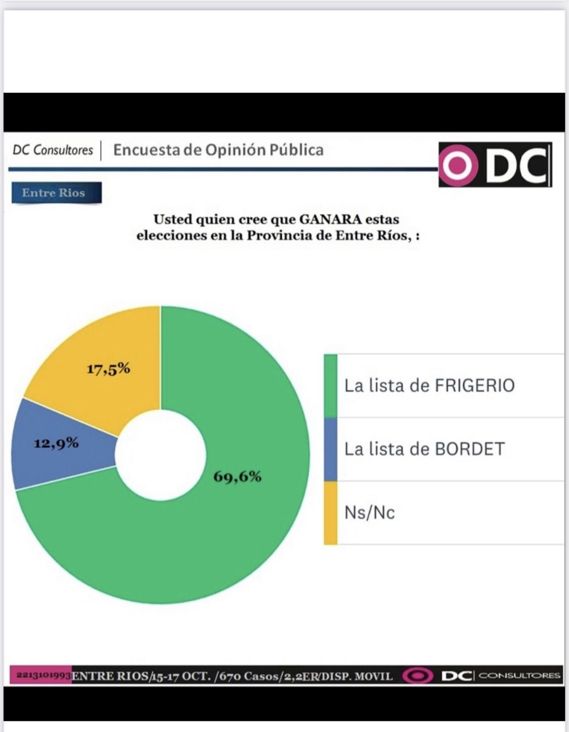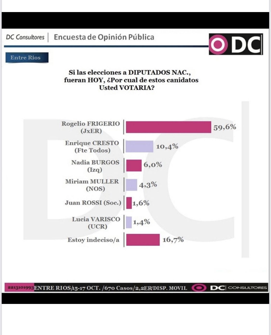 Lo más llamativo del sondeo es que a menos de un mes de las elecciones generales todavía hay un 16,7% de indecisos. Con lo cual Frigerio podría superar el 60% y el intendente de Concordia subir un poco más pero sin chances de hacer una performance electoral decorosa. Hasta ahora el joven dirigente estéril realizando la peor elección del peronismo en la historia de esta provincia.