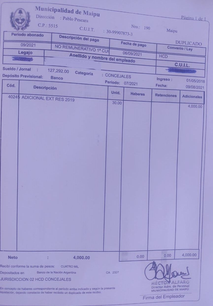 Otro de los bonos de sueldos que se consiguió del departamento de Maipú, corresponde a un "Bono Covid", el mismo se pagó durante el año pasado y rondaba los 2.500 pesos. Desde el municipio aseguraron que ese ítem los ediles no lo habían percibido.