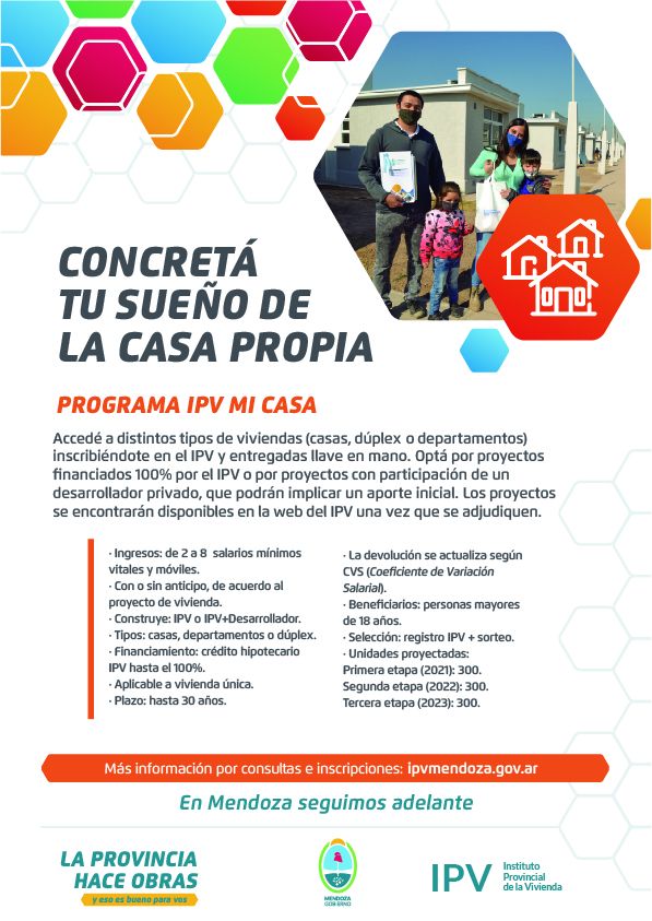La vivienda es una de las principales demandas sociales, tema que se agudizó por la crisis: gran parte de los proyectos particulares y privados fueron truncados por la falta de crédito. Por eso el IPV toma un rol clave. Ahora el Gobierno de Mendoza apunta a reactivar la construcción con nuevas líneas de crédito y promoción. Una de ellas es el plan "Mi Casa", donde el Estado financia el 100% de las viviendas. Ese plan está destinado a familias que tienen ingresos de hasta 240 mil pesos, es decir 8 salarios mínimos.