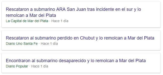 En el texto publicado, del cual mostramos una captura, se podía leer: "se investiga un problema eléctrico que pudo haber causado un incendio dentro de la embarcación que tiene su apostadero en la base naval Mar del Plata". Recién a las 8:30 hs de ese día se corrigió la información a través de un comunicado desde el Comando de Submarinos donde se indicaba que aún no se había podido retomar el contacto, y que la búsqueda de la nave continuaba.