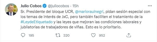 El senador Julio Cobos, uno de impulsores del proyecto, en conjunto con la legisladora kirchnerista, Anabel Fernández Sagasti, le había solicitado al presidente del bloque, Mario Negri, que facilitaran el tratamiento de la Ley de Etiquetado frontal, además de las solicitudes anteriormente mencionadas.