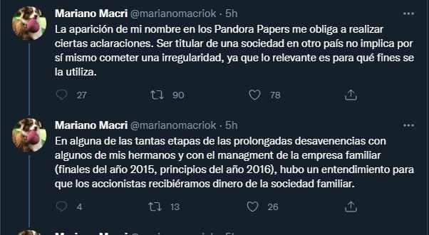 El empresario de 56 años justificó este procedimiento y negó que se tratara de algo ilegal, mientras que volvió a despegarse de su familia y a acusarlos de no pasarle dinero. “La aparición de mi nombre en los Pandora Papers me obliga a realizar ciertas aclaraciones. Ser titular de una sociedad en otro país no implica por sí mismo cometer una irregularidad, ya que lo relevante es para qué fines se la utiliza”, comenzó señalando.