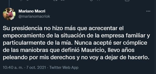 “Lamentablemente debo seguir luchando por lo que me corresponde porque mi hermano mayor mantiene su postura de creer que toda la familia debe estar encolumnada en sus proyectos políticos y personales. Su presidencia no hizo más que acrecentar el empeoramiento de la situación de la empresa familiar y particularmente de la mía. Nunca acepté ser cómplice de las maniobras que definió Mauricio, llevo años peleando por mis derechos y no voy a dejar de hacerlo”, señaló al finalizar.