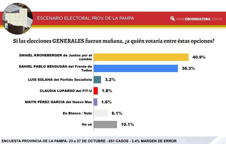 En La Pampa Juntos por el Cambio dio el batacazo en las primarias y derrotó al peronismo. Desde el 12 de septiembre el oficialismo pampeano ha redoblado los esfuerzos para revertir esa tendencia pero CB Consultora sostiene que el opositor Daniel Kroneberger aventaja por casi cinco puntos a Daniel Pablo Bensusán, del Frente de Todos.