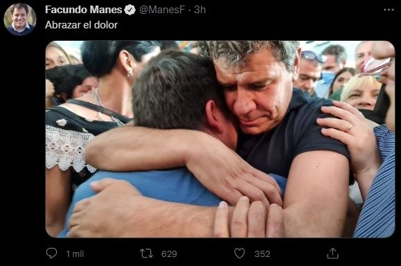 La publicación se realizó pasadas las 10 en la cuenta oficial de Twitter del candidato. El mensaje era breve: "Abrazar el dolor". Pero lo que no cayó bien fue la foto, que mostraba a Manes abrazando a uno de los familiares de Roberto Sabo, el kiosquero asesinado en Ramos Mejía durante un asalto.