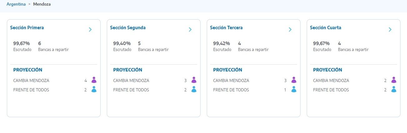 El oficialismo ganó incluso en territorio clásico del peronismo, como Maipú y San Rafael, cuestión que le sumó para la segunda y cuarta Sección electorales. En la primera y tercera secciones el dominio de esa fuerza política y era contundente.