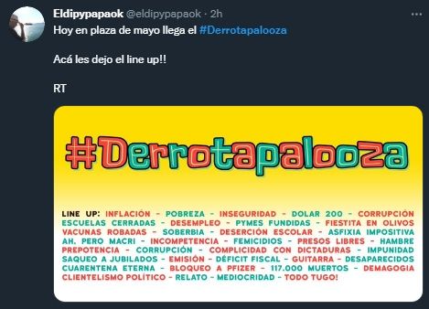 En medio de la movilización del oficialismo para festejar el Día de la Militancia, desde la oposición impulsaron el hashtag #Derrotapalooza para burlarse del peronismo tras la dura derrota electoral que sufrió en las elecciones legislativas del domingo.