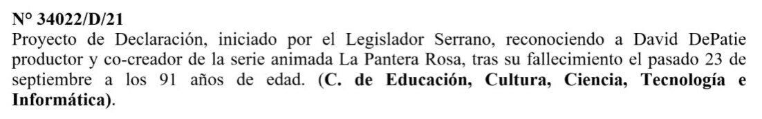 El texto que hizo oficial el Gobierno de Córdoba, se propone reconocer “a David DePatie productor y co-creador de la serie animada La Pantera Rosa, tras su fallecimiento el pasado 23 de septiembre a los 91 años de edad”.