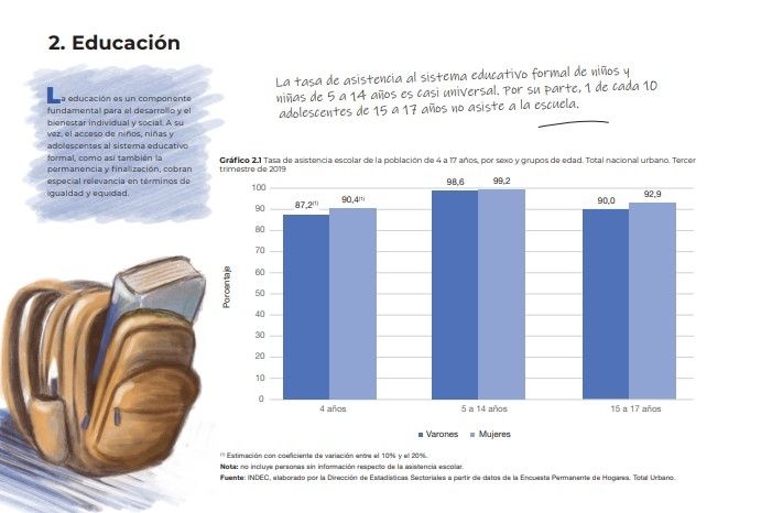 El derecho a la educación está casi garantizado en el nivel primario. Pero la desigualdad llega antes: un cuarto de los niños de sectores menos favorecidos económicamente no accede al nivel inicial (sala de 4), mientras que en el quintil de mayores ingresos casi todos logran un lugar. Las tareas que deben hacer muchos niños y adolescentes -y que no están dentro de lo que deberían hacer- es un condicionante para el futuro.