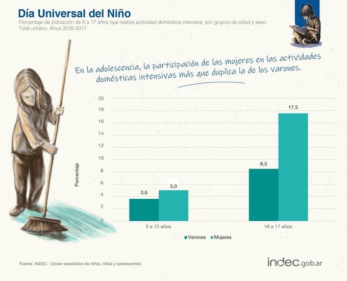 Es lo que pasa con las adolescentes que se hacen cargo de tareas del hogar (con el sesgo de género extra que también tiene) y con quienes realizan alguna actividad productiva. Según el dossiere estadístico del INDEC; hay una relación entre el desempeño y el abandono escolar y el trabajo. El 5% de las niñas trabaja de manera intensiva en el hogar y el 17% de las adolescentes también. En el caso de los hombres, el 4% de los niños trabaja y el 21% de los adolescentes está vinculado a algún empleo o actividad productiva.