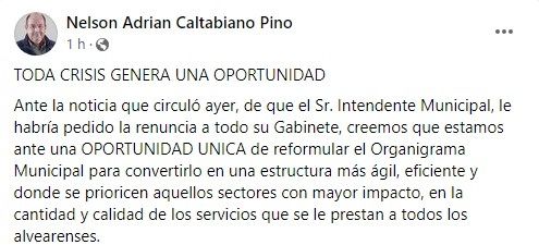 Frente a esta situación que está atravesando el Gobierno de Marcolini, Caltabiano aprovechó la oportunidad y le envió al intendente una nota para poner a disposición a los equipos técnicos de Cambia Ya para realizar una reformulación del organigrama municipal.