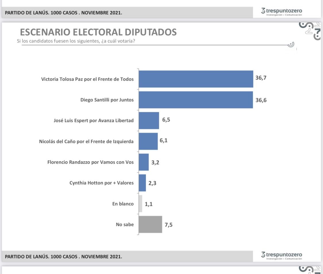 Pese a que algunos pronósticos indican que el Frente de Todos se está recuperando electoralmente en la poderosa Tercera Sección Electoral (sur y oeste del Gran Buenos Aires), en un distrito estratégico como Lanús no se registra esa tendencia y además Juntos se estaría imponiendo por una escasa diferencia, según la última encuesta de la consultora Trespuntozero.