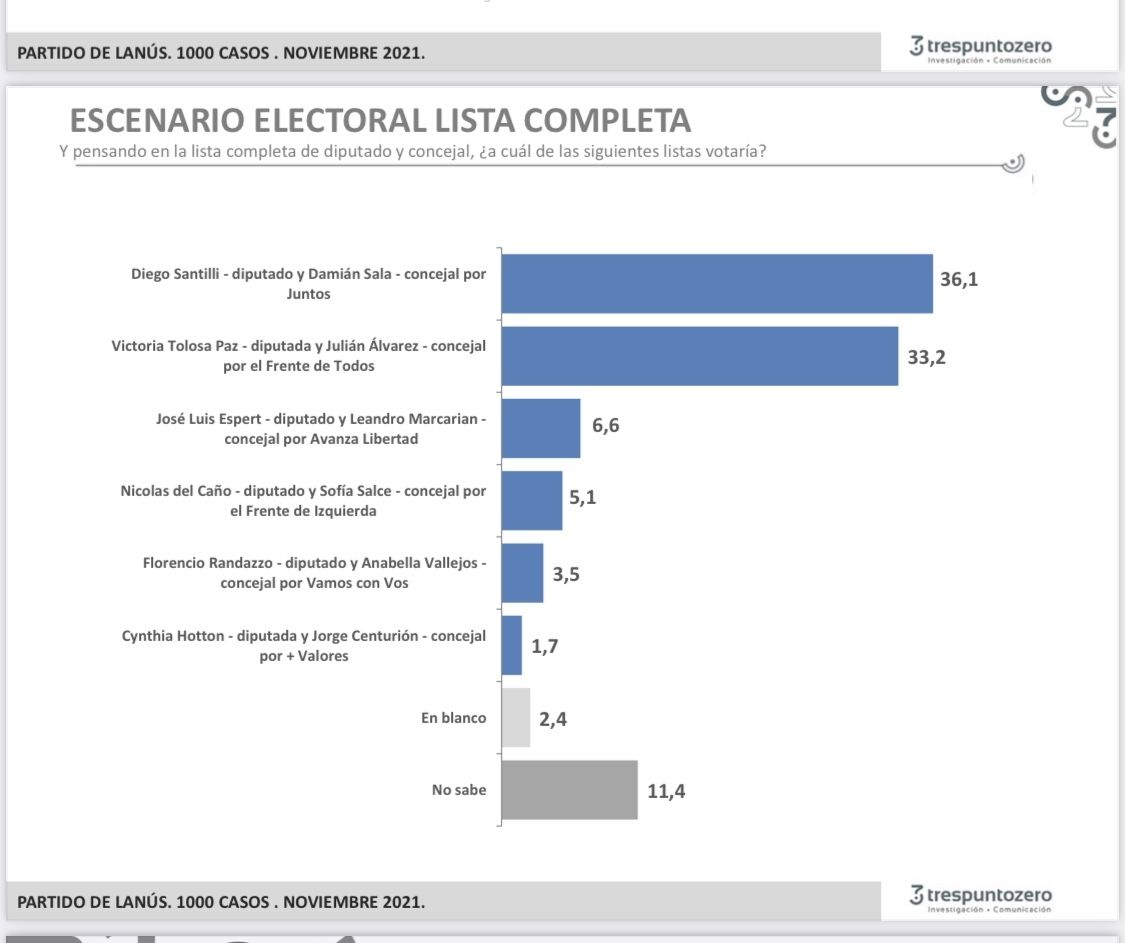 Aunque paradójicamente cuando se mide por candidatos a diputados y a concejales al mismo tiempo la coalición opositora logra tomar la delantera y sacarle 3 puntos de diferencia a Todos. Santilli y Damián Sala (hombre de Grindetti) alcanzan un 36,2% contra el 33,2% de la dupla Tolosa Paz-Julián Álvarez. Este escenario, si no hay corte de boleta, podría favorecer al candidato de Horacio Rodríguez Larreta.